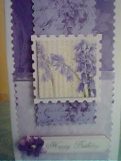 I made this card from 3 different lilac backing papers which I zig-zagged with scissors. I added a bluebell topper on top of a strip of silver and lilac ribbon. There are also 5 little butterflies that are the cut-offs from the butterfly punch (I don't throw anything away!) lol